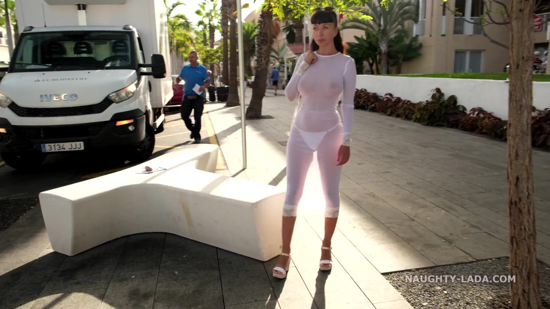 I walk in the city wearing see-trough dress