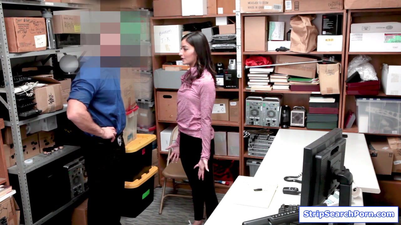 A security officer confirms that the brunette teen he caught is a shoplifter.He orders a strip search, getting her bra and panties removes.The petite babe cooperates,blowjobs his big cock.He masturbates her clit then fucks her shaved pussy.