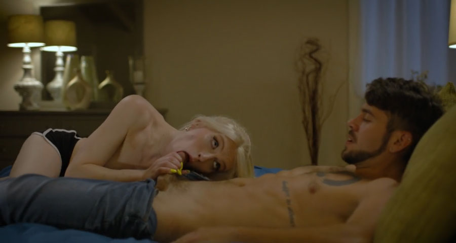 Stepbro closes the door of his shemale stepsister and then they start kissing each other on her bed.After that,he lets her throats his hard big cock passionatel and in return,he bareback fucks her wet ass so deep and hard.