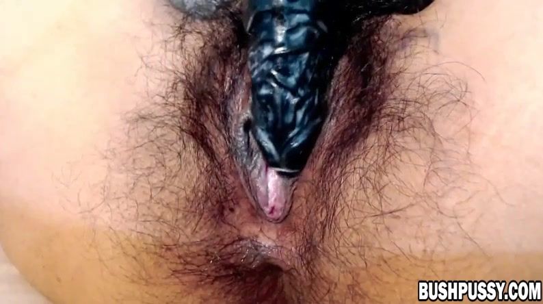 Babe fucks her creamy hairy bush pussy with dildo while closeup on webcam