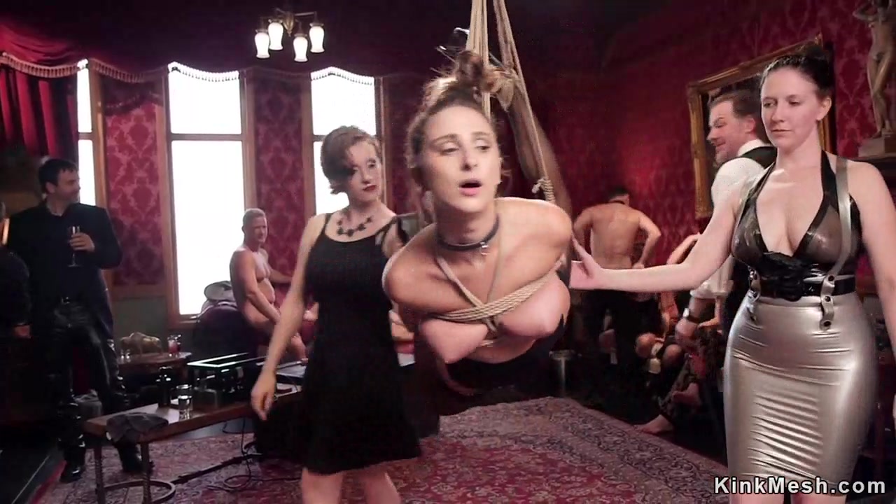 Natural busty brunette trainee slave Ashley Adams is suspension gets zappered while other hot slaves fucking in bdsm orgy party in the upper floor