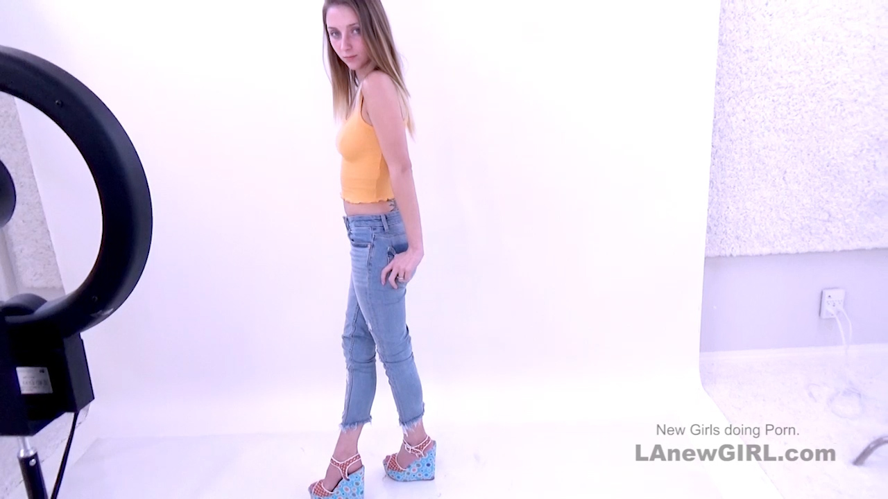 This sweet blonde with green in her eyes looks ravishing in her yellow crop top you can see her nipples through it since she is not wearing a bra