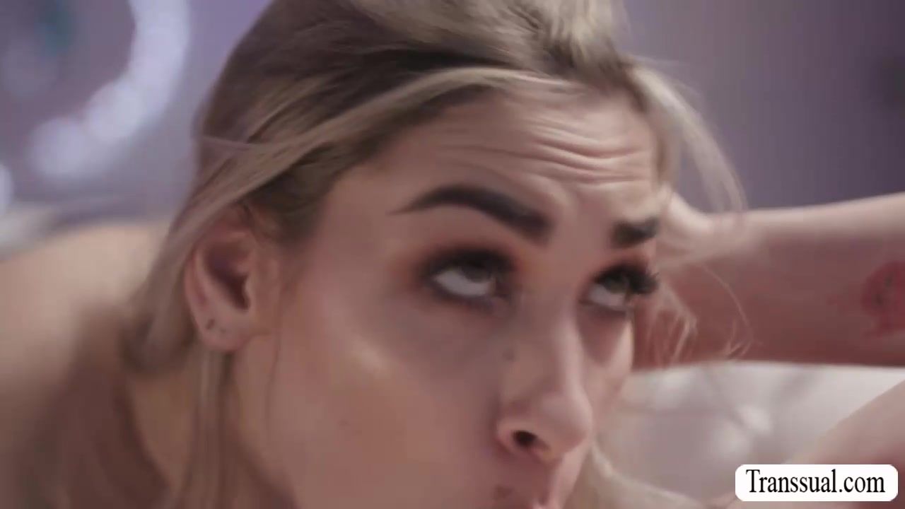 Blonde shemale and her dance partner are on the floor warming up.After that,they get horny and they start kissing each other on the couch.Next is,she lets her horny partner suck her shecock and in return,she licks her pussy first before she fucks it.