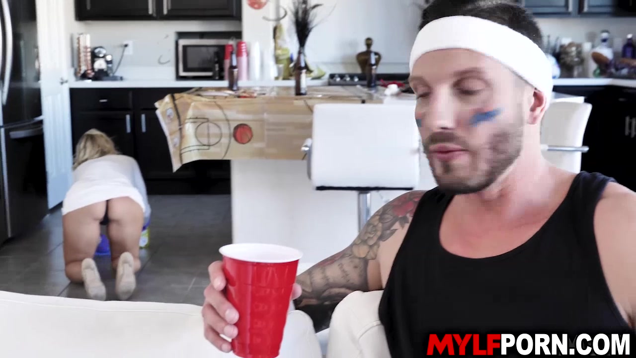 Sporty MILF Katie Morgan invited her guy friends to watch a game in her house.She suddenly feels horny and seduces one of them and ended up fucking on the kitchen counter.