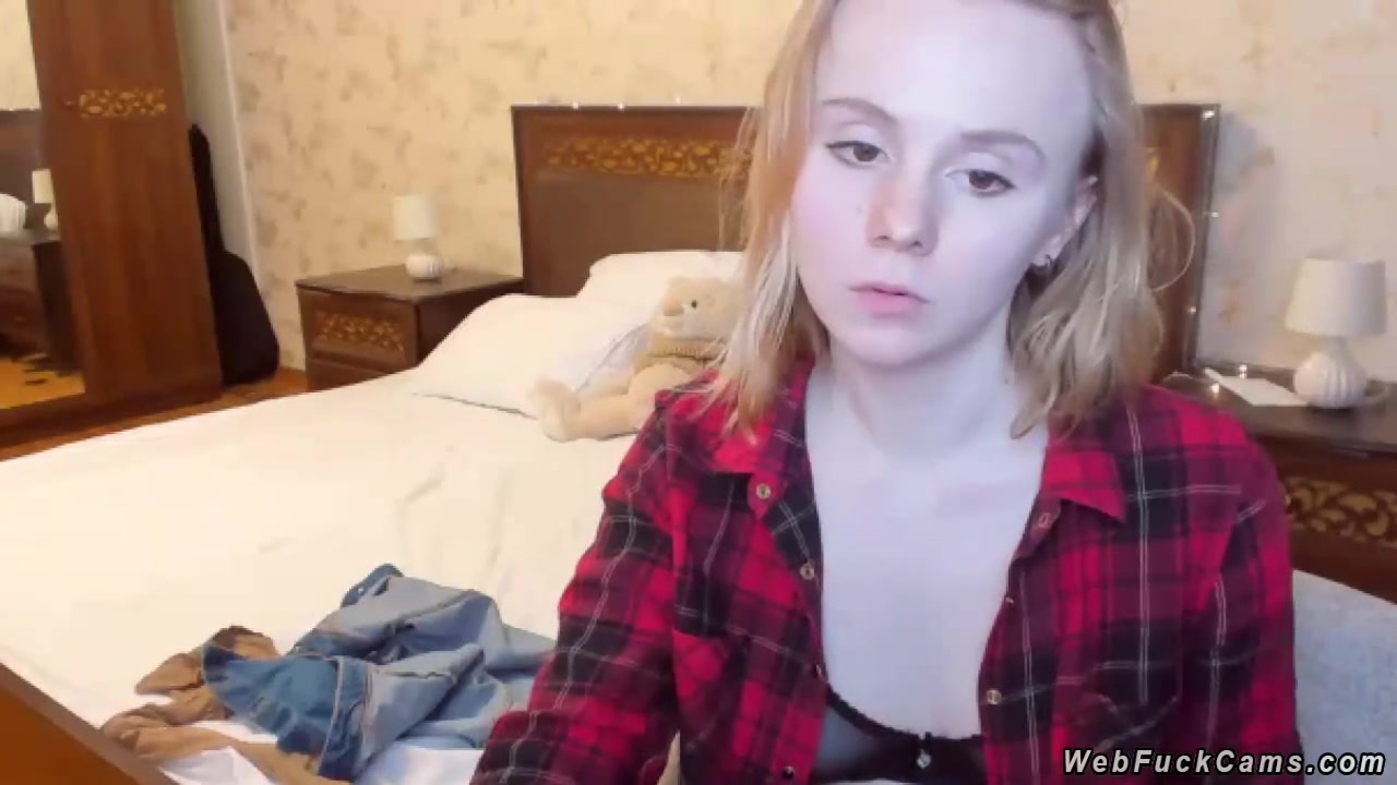 Blonde amateur teen camgirl in shirt and denim mini skirt strips off her stockings then opens her shirt and flashes boobs in black bra on webcam