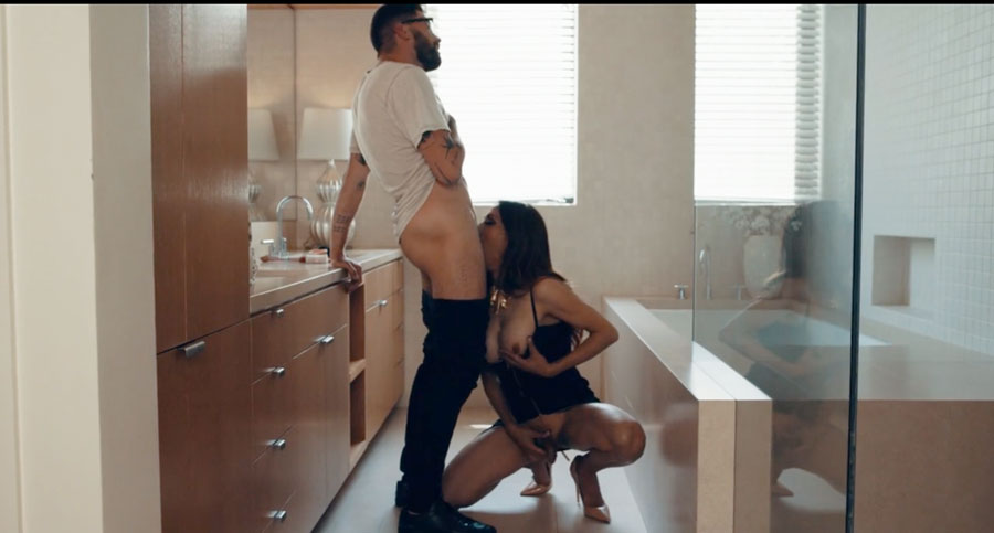 Horny MILF shemale is jerking off her shecock in the bathroom.After that,her stepson is watching her and instead of getting mad,she throats his hard big cock passionately.In return,her stepson bareback fucks her ass so hard.