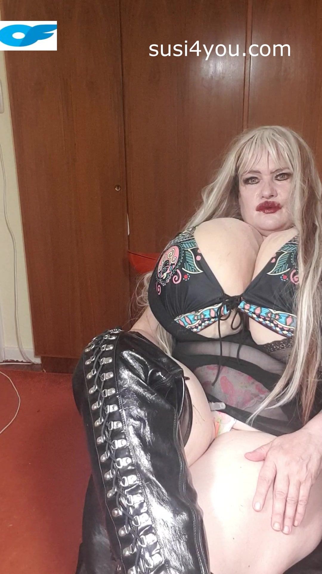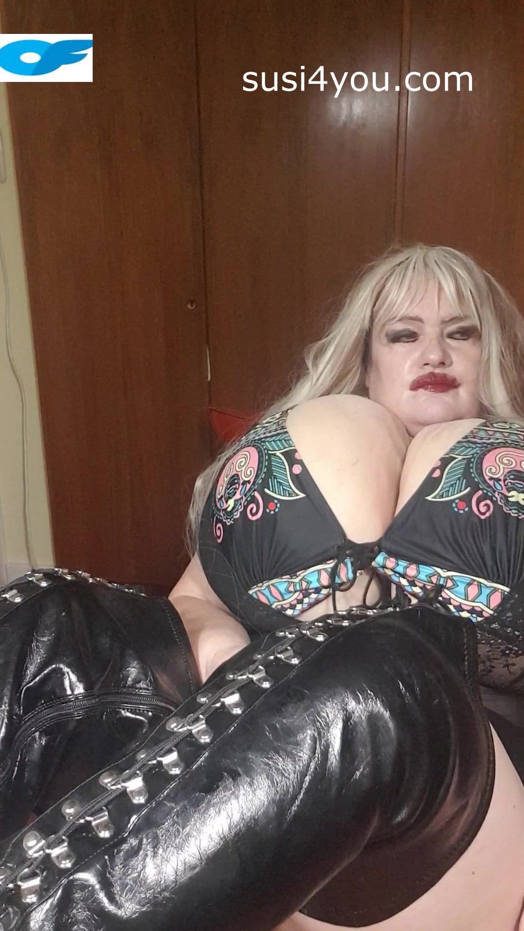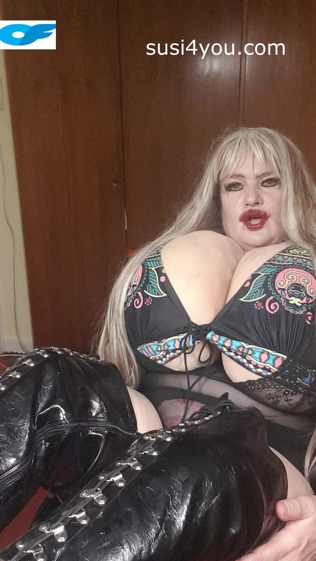 Susi wears black boots and is horny, she raises her legs shows you her heels lick them then she shows you her fat tits and her muffin pussy she spreads her legs lick me she gives you licking instructions for her sexy boots and her wet pussy