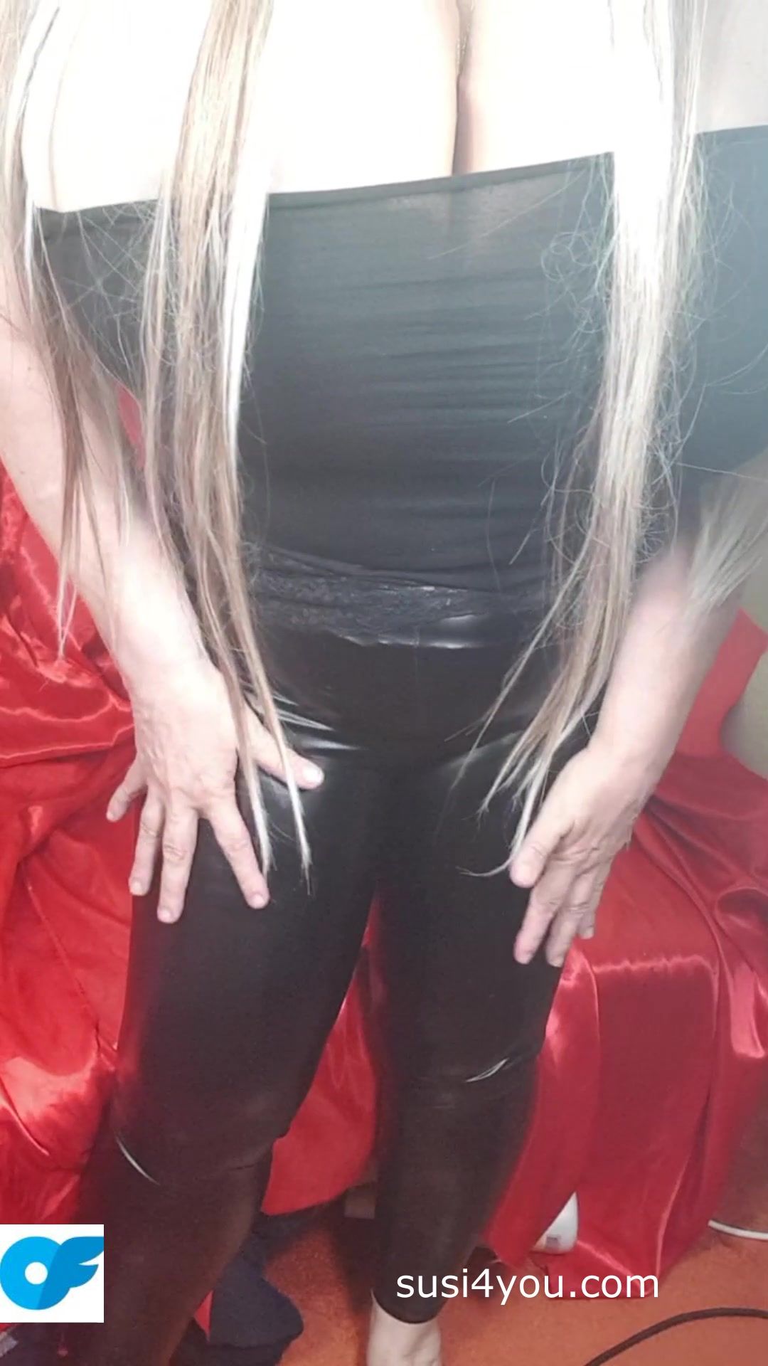 Susi is wearing black latexpants and black t shirt. She is teasing you with her fat ass. She is pulling down latex pants showing fat cup k tits. Enjoy those fat tis and big ass She is showing asshole lick it and come with her.