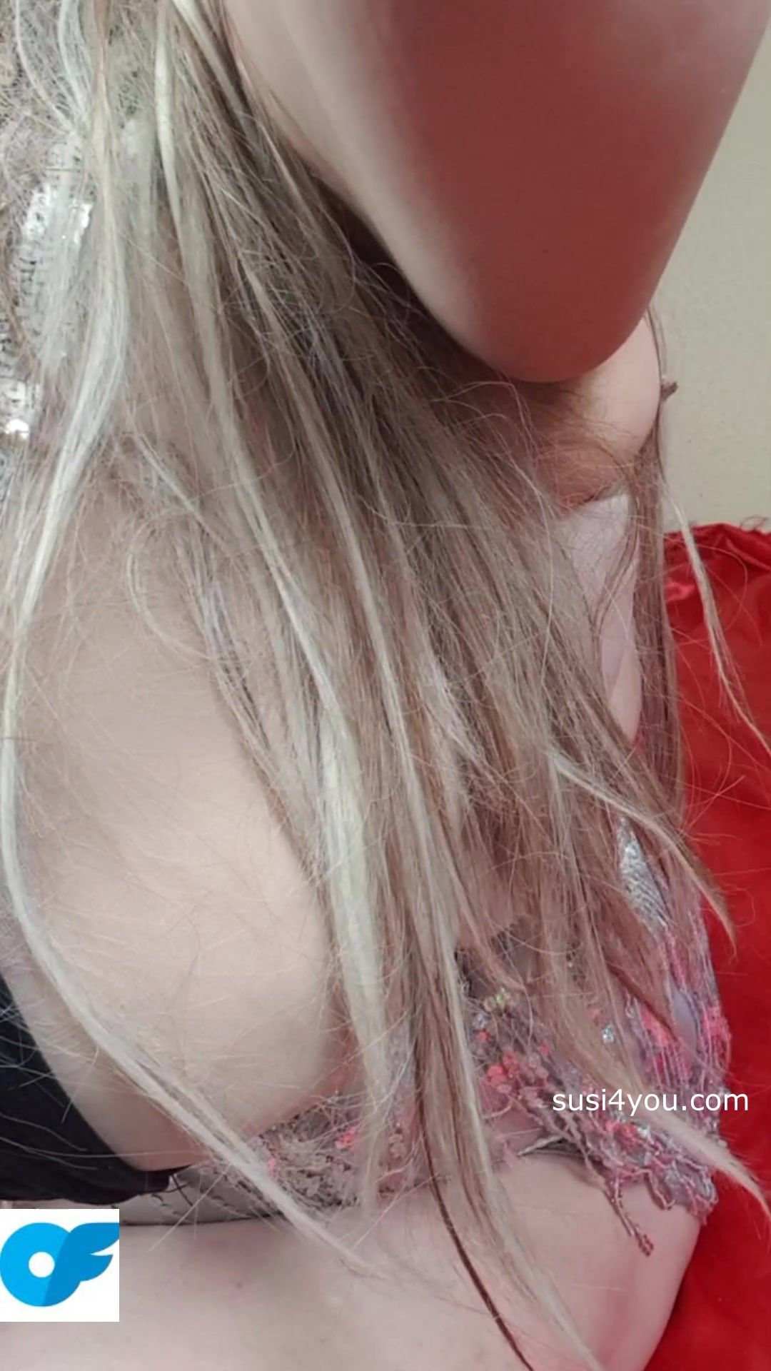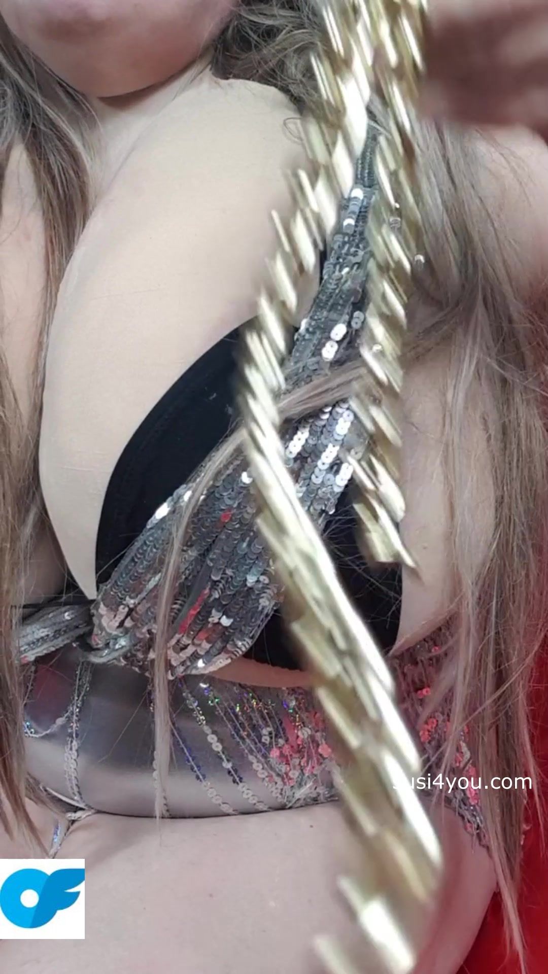 Take a look at sexy Susi. She is lying on the back she is wearing a silver scarf around her big cup k tits and a black bikini She is now lying down on her back spreading her legs showing ft muffinpussy showing huge boobs stuffing a golden chain in her pussy enjoy it and cum with me.