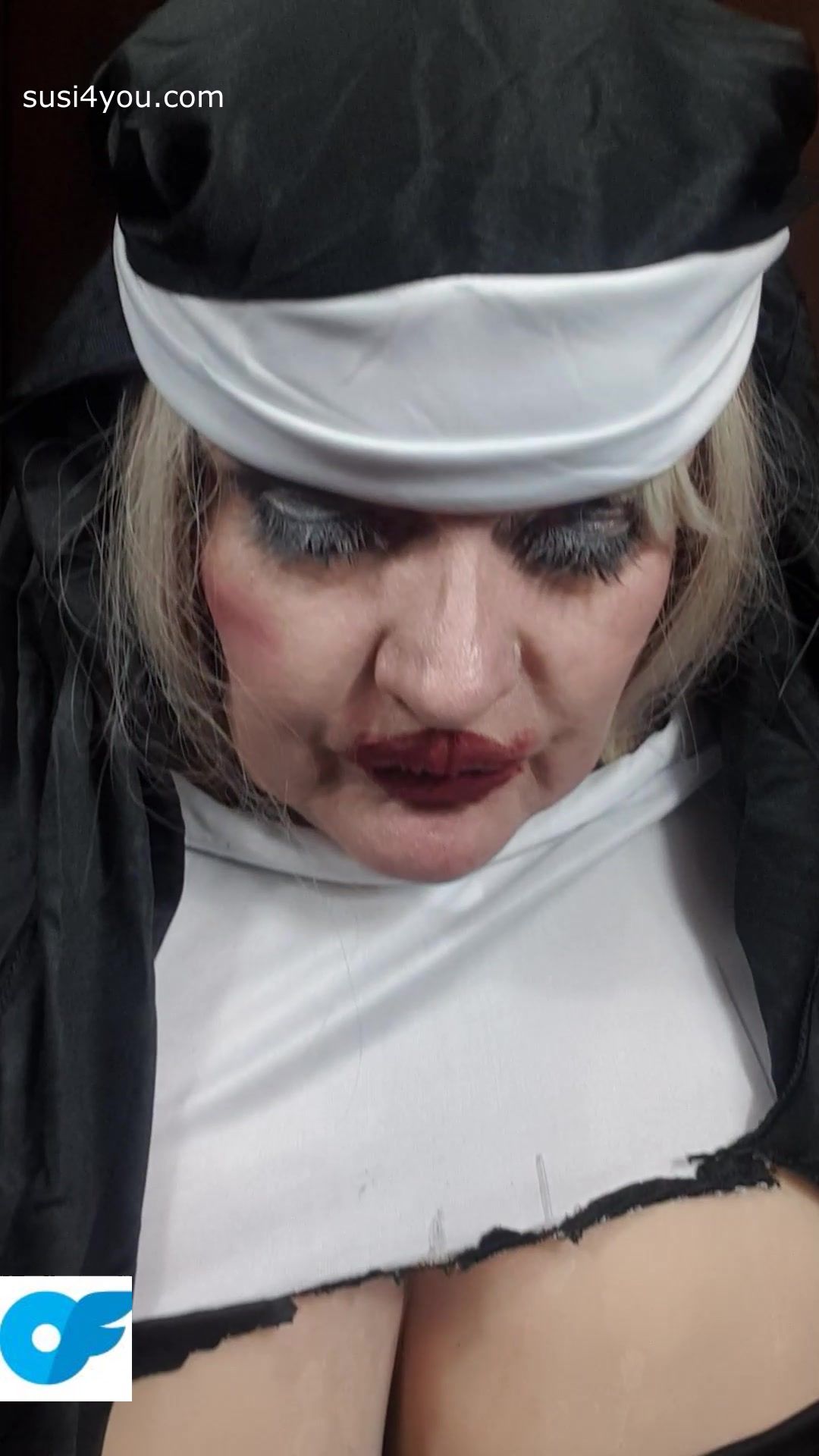 Let s have fun in nasty costume of a nun. Susi has her costume of a nun on and wants to take all your cum. She is moaning and pulling down her top. She lies on the back to show big pussy and fat tits She is spreading her legs so that you can see her sexy pussyhole Gimme all.