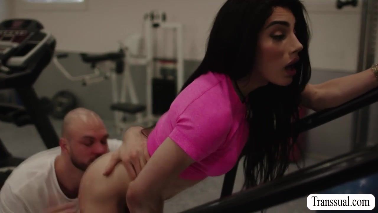 Bald dude cant resists the hottness of Trans Woman working out in the gym.He close to her and he then licks her ass to makes it wet before he puts his dick inside her ass.After that,he lets her throat his dick and fucks her ass again and again.