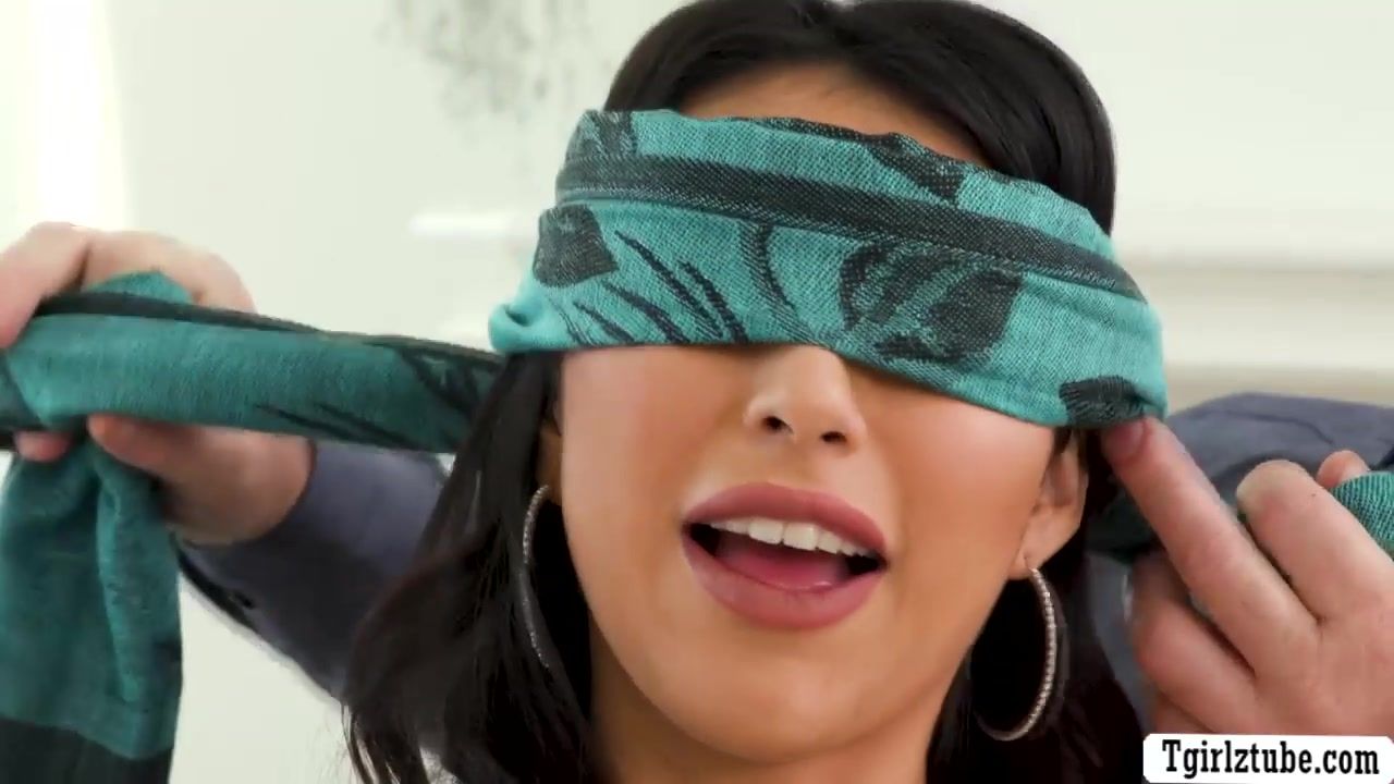 Horny dude surprises his busty girlfriend and she then blindfolded her.After that,he brings in the TS he ordered and they start kissing each other.After that,he lets her girlfriend suck their cocks and he fucks both their ass and pussy so hard.