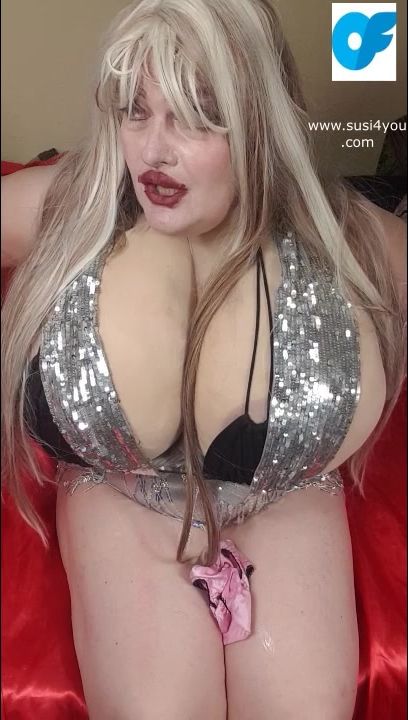 Lady with a silverscarf is on her bed Susi is taking a pink panty to stuff it in fat pussy Enjoy it and gimme all your cum She is spereading her legs showing her pussy and big tits so fat cup k size lic it suck it nasty horny boy.