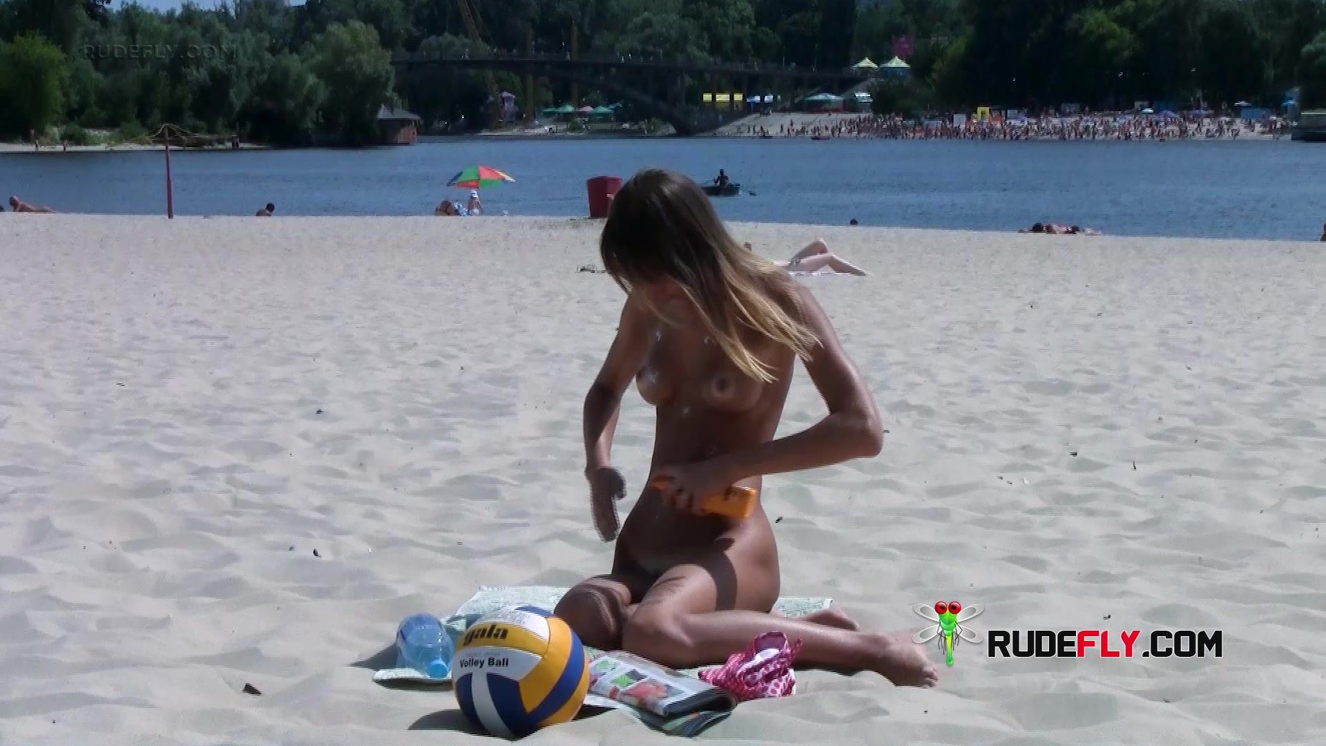 Nude beach girl lays on the beach, but she likes her body to feel something rough