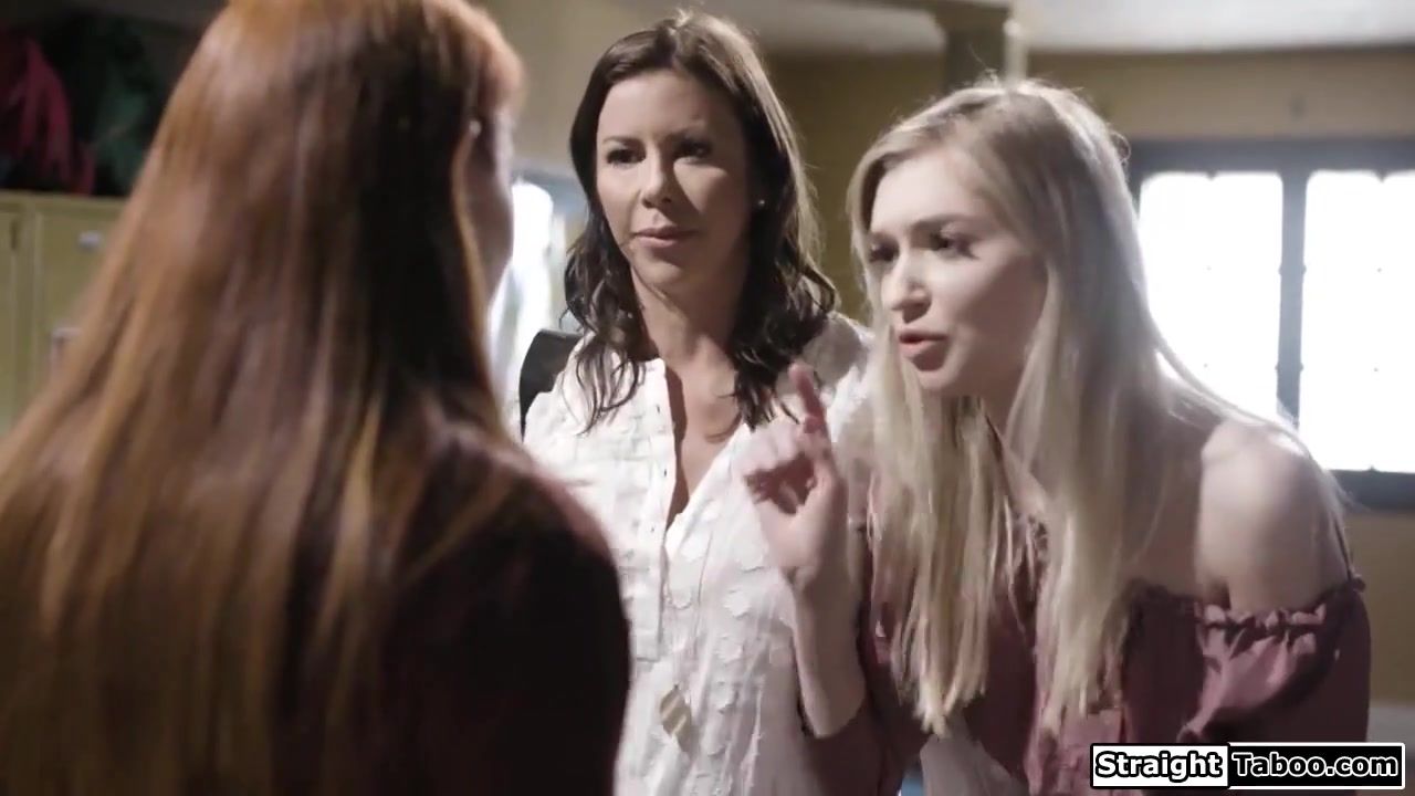 Mature teacher makes big tits stepmom spank petite stepdaughter for cheating on class.She dominates em to kiss and then the busty milf gives her oral sex as the redhead masturbates her shaved pussy.Then the blonde licks the older woman cunt in 3some