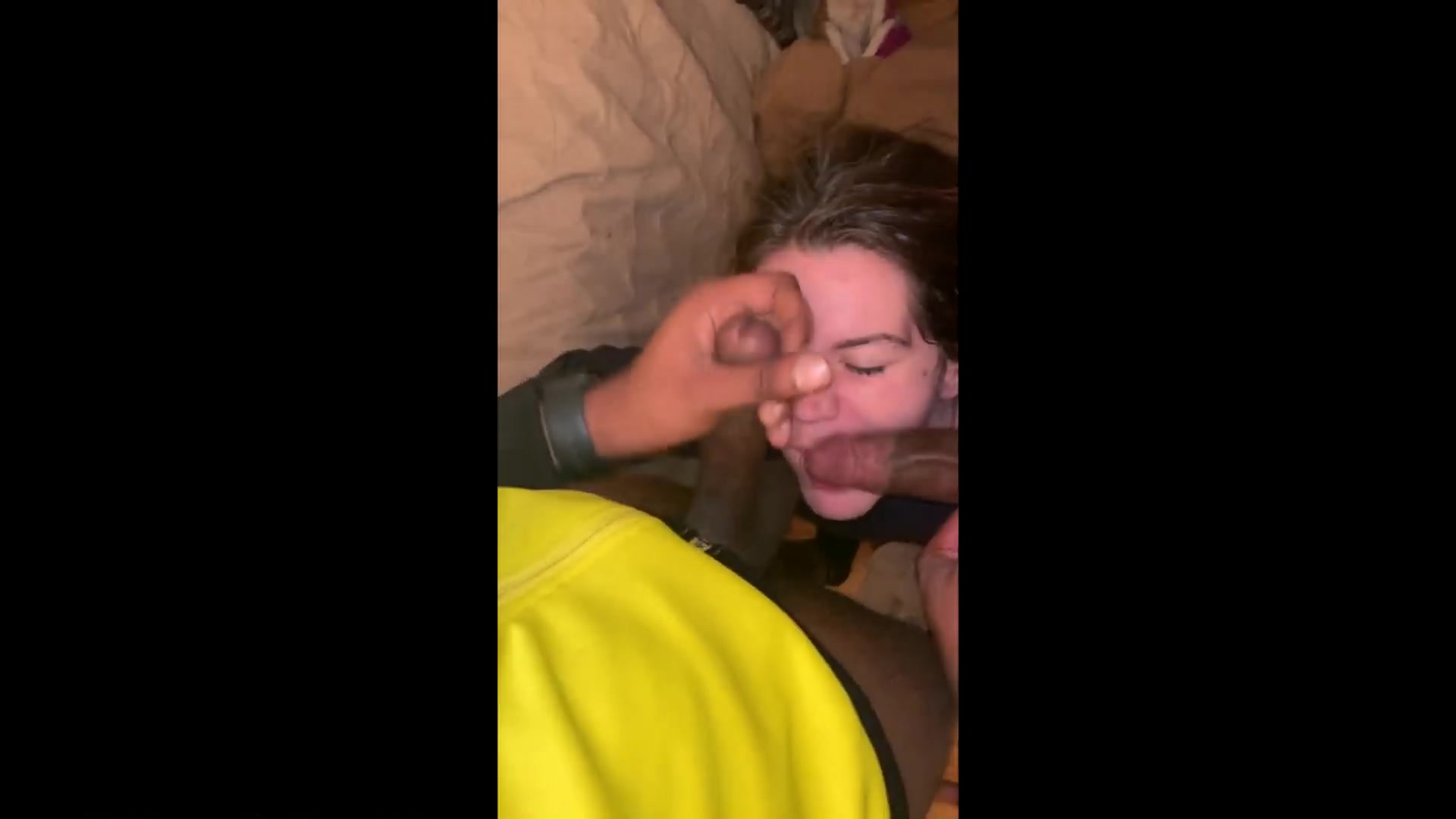 Description: Very horny amateur teen girl blowing two black cocks and she loves it