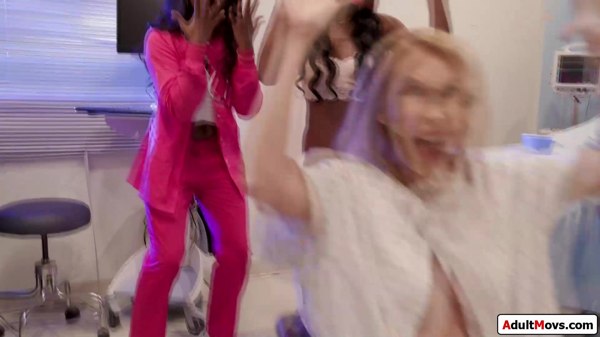 Patient sees his small tits black gf lick a nurse and offers his boner.The babe fucks his dick while giving the ebony nurse oral.Both ladies deepthroat his big cock.He bangs the nurse while she is facesitted by the small boobs cuties hairy snatch