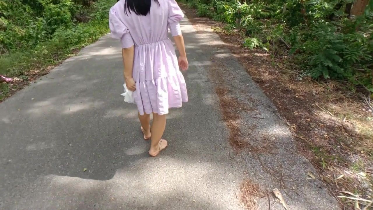 Couple walking in the forest and fucking cum gets a creampie sex in a creampie public park เย็ดในป่า outdoor cum