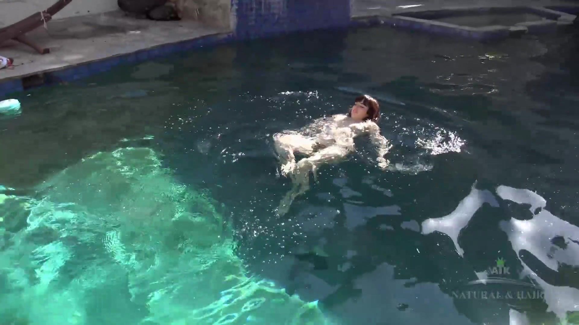 Curvy hairy brunette Simone Delilah strips in her hot tub and rubs her clit