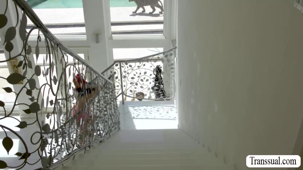 Busty TS caught his boyfriend having sex with her bitch stepsister in the kitchen.She grabs her hair upstairs and then she lets her throat her tranny cock.After that,she lets her boyfriend lick her stepsis pussy and they fuck it so hard.