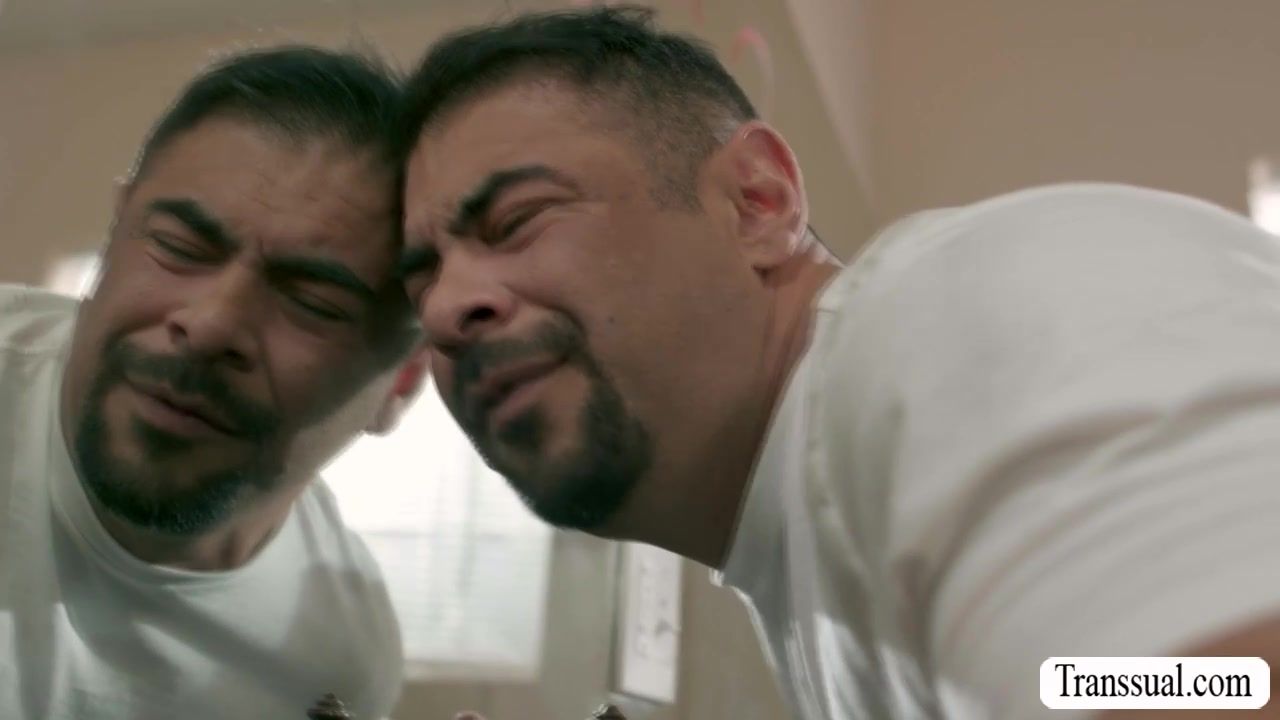 Masturbating TS caught her stepbro watching and instead of getting mad,she grabs him inside the bathroom and lets him suck her hard shecock passionately.In return,she licks his big ass first and she then fucks it so deep and hard.