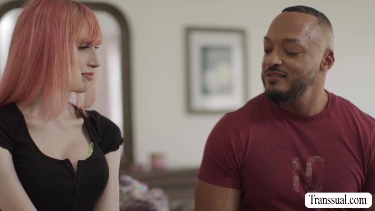 Black stepbro and his pink haired TS stepsis are on the bed kissing each other passionately.After that,he lets her throat his big black cock passionately and in return,he bareback fucks her tight wet ass so deep and hard.