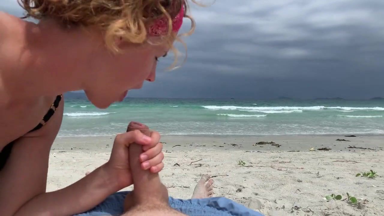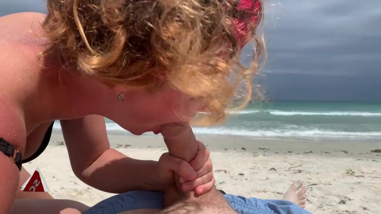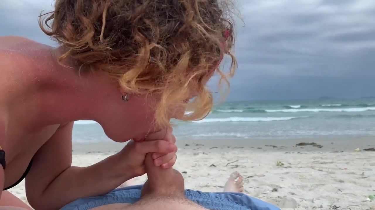 Deep blowjob on the beach, girl in bikini sucking cock, cum mouth outdoors