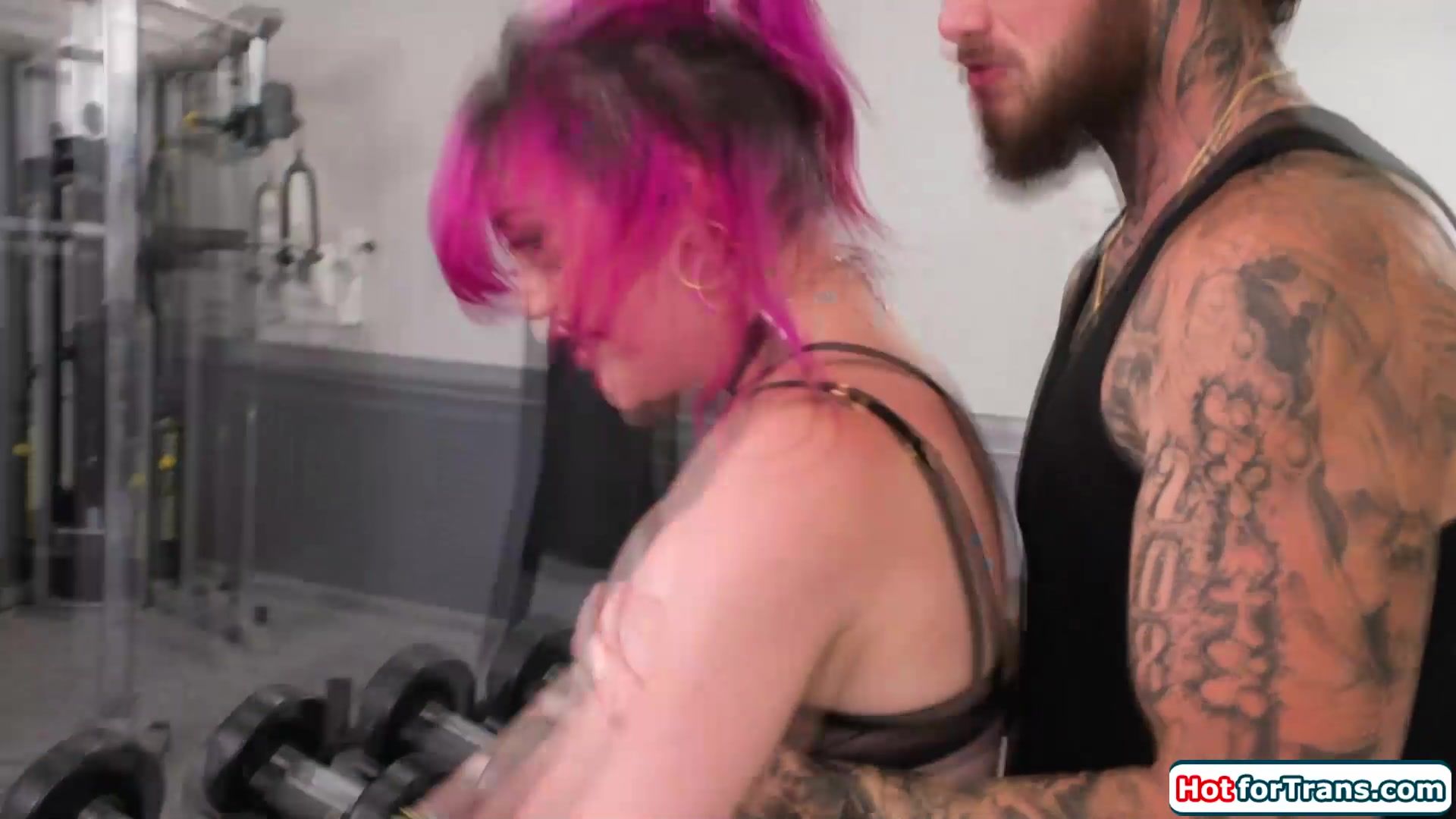 Stuck tattooed shemale babe Lena Moon wants help but the guy first wants to lick her ass.The tgirl sucks his big cock in order for him to release her.As a reward he doggystyle barebacks the tranny.Then the pink haired trans babe anal rides