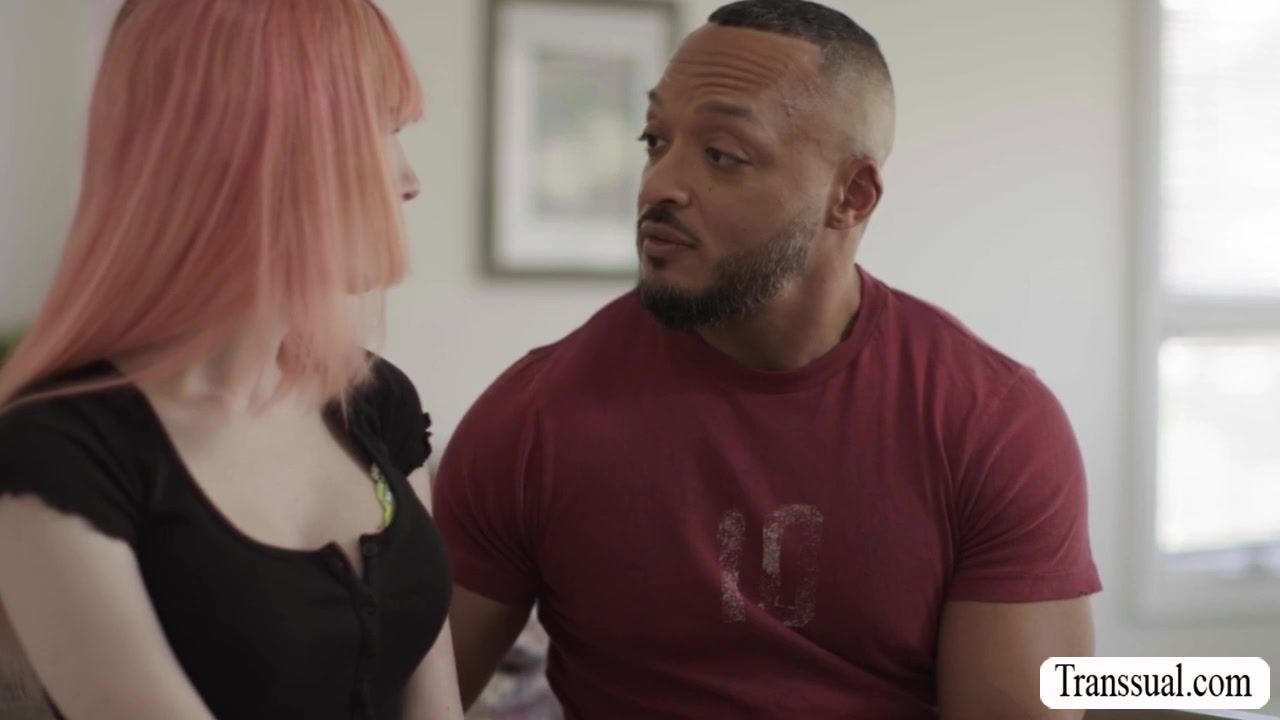 Busty TS stepsister and her black stepbrother are on the bed kissing each other.After that,he throats his hard big black cock passionately.In return,her stepbrother bareback fucks her tight ass so deep and hard.