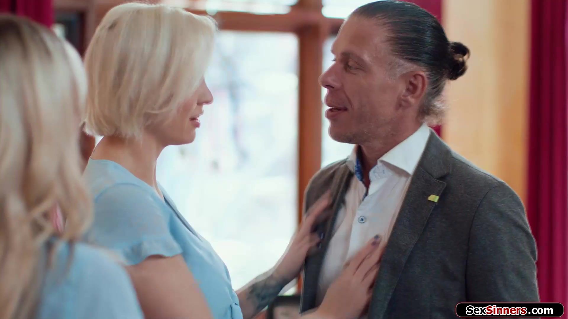 Busty wife surprises husband with a younger version of herself for a threesome.The petite blonde strips and deepthroats his big cock while the big tits milf facesits him.He bangs the cutie who licks the cougar n then fucks his wife while being rimmed