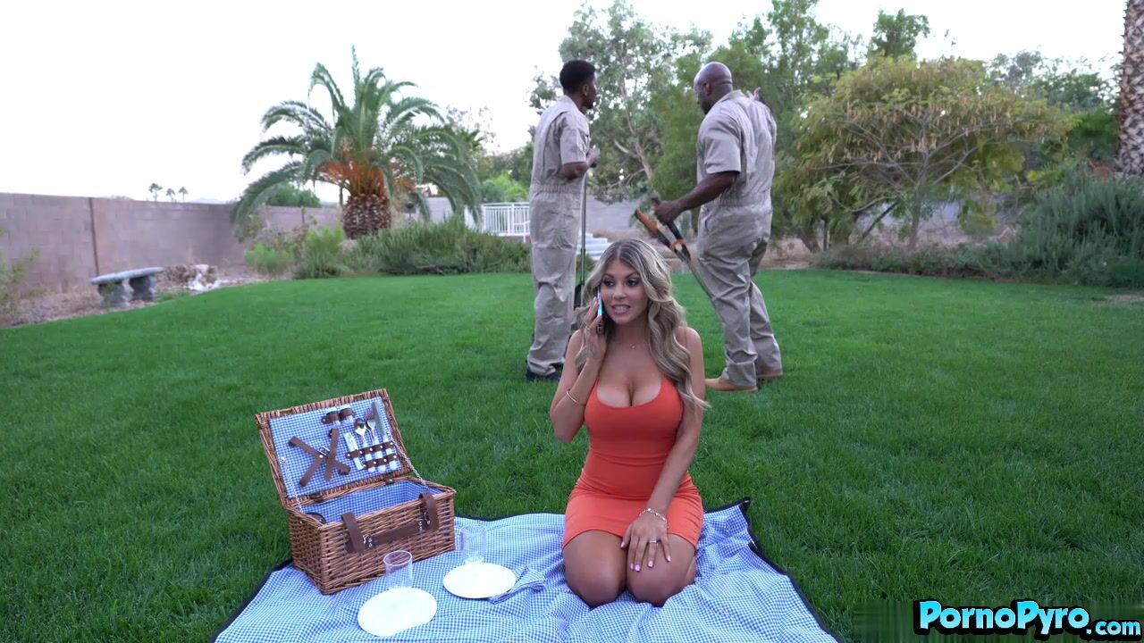 Kayla is hoping for a romantic picnic with her Husband, but after setting up her picnic outside her Husband calls to cancel because he had to take a last minute business trip. She realizes it's gardening day and she decides that she should just invite the 2 Handsome Gardeners inside and have some...