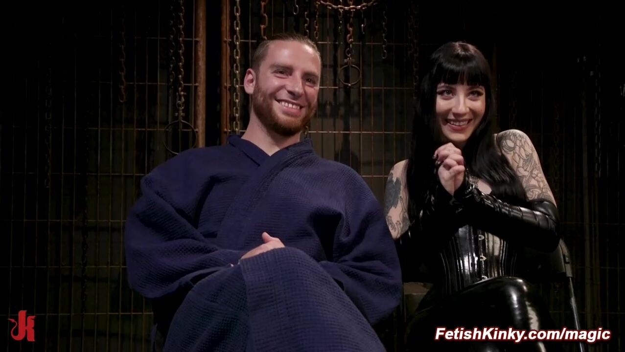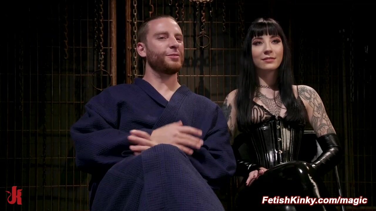 Dressed in tight black this slender goddess of the dungeon Charlotte Sartre torments tied up and gagged slave Sebastian Keys then makes him fuck her with black strap on cock after face sitting him