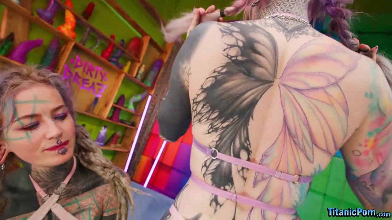 While on a weekend getaway in Germany, director Proxy Paige shoots pictures of radically tattooed models Kellie Panther and Anuskatzz. Kellie's big tits and booty burst from her tight bikini through a sexy tease intro; Anuskatzz flaunts her chunky rump and fit, elaborately inked body.
