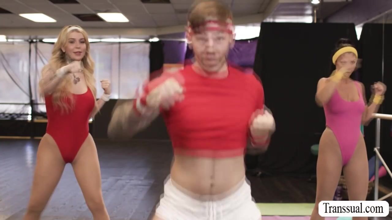 Shemale Gracie Jane and Queenie Sateen are doing their dance work out with their instructor Steve Ricks.After that,they get horny and Gracie starts ripping off Queenies stocking and she then fucks her wet pussy so deep and hard.