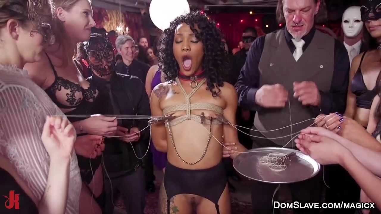 Huge tits blonde MILF Dee Williams and ebony slave Nikki Darling are bound and punished then interracial ass to mouth fucked by bbc Donny Sins at Folsom orgy party