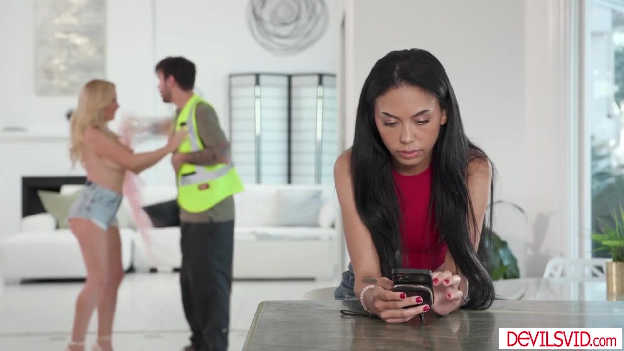 Stepdaughter Bianca Bangs caught her stepmom Danielle Renae letting the delivery guy lick her shaved pussy.The teen latina gets horny and starts masturbating while the big tits milf is deepthroating the dude before having him fuck her hard.