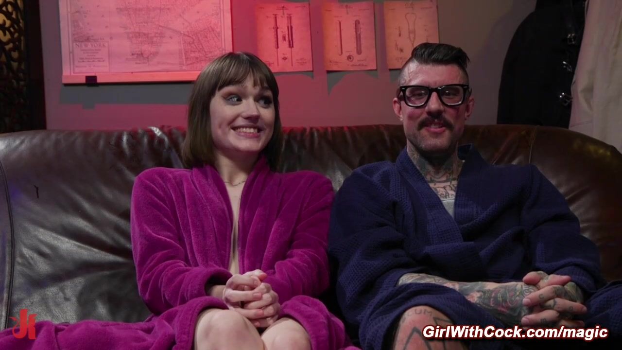 Notorious tattooed former priest H3ll4Sl00tz in gloves disciplines and gropes sexy brunette shemale student Sadie Lola then fucks her in mouth while she is down on her knees