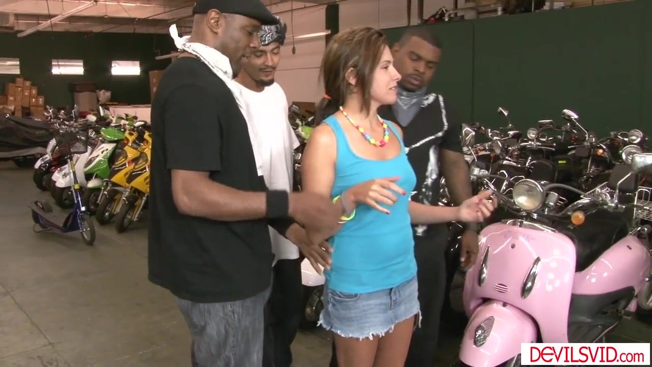 Brunette Danica Dillan wants to check her bfs motorbike in the shop but she ends up getting gangbanged by three black men after offending them.The guys strip the petite babe naked and take turns face fucking and double penetrating her ass and pussy.