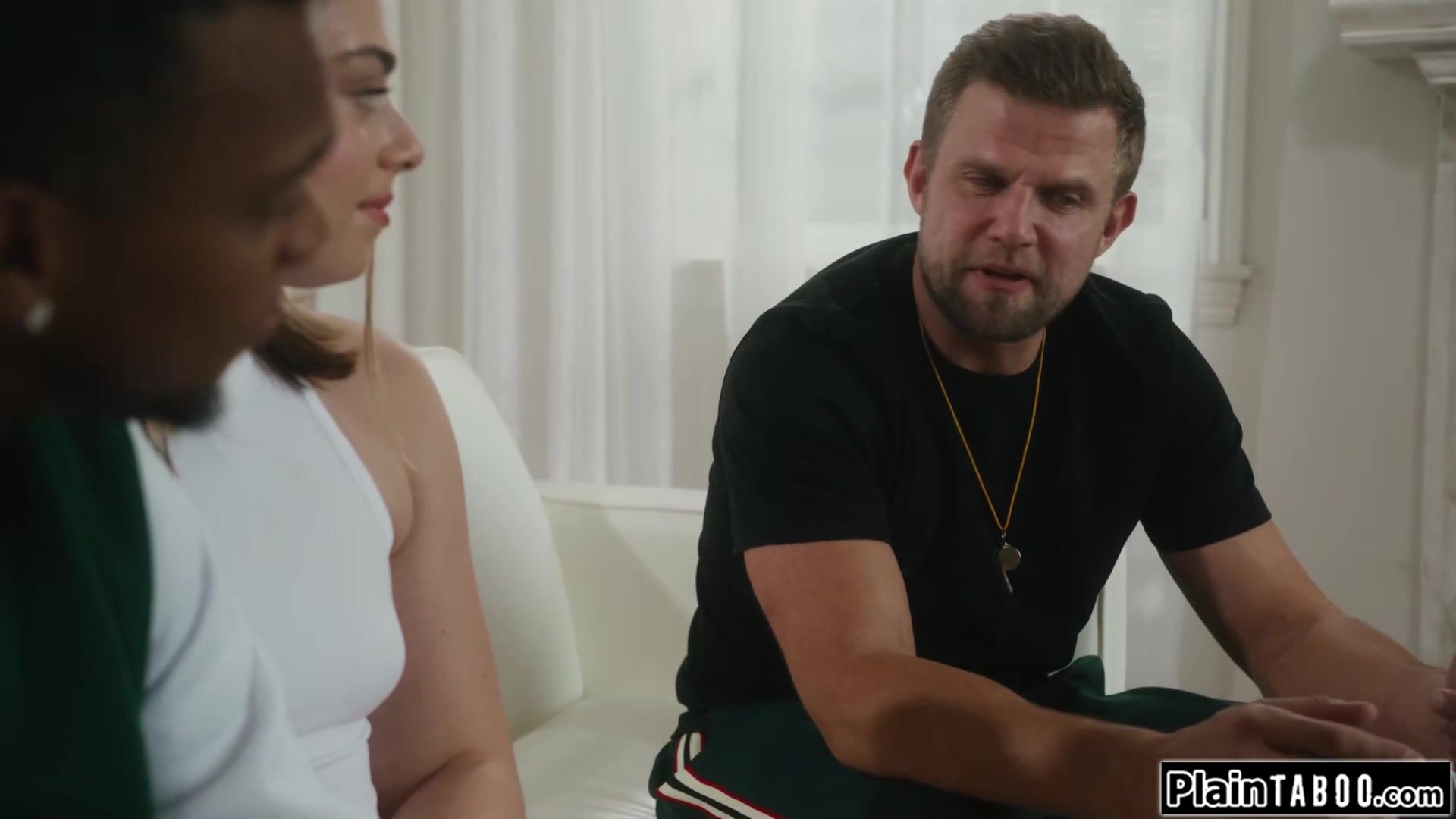Teen Sophia Burns cheated on her bf with his coach and got pregnant.To cover it up they need to get her bf to let him fuck her ifo him.The guy agrees and licks his small tits gf ifo his coach.He gets his bbc sucked while his coach bangs his gf