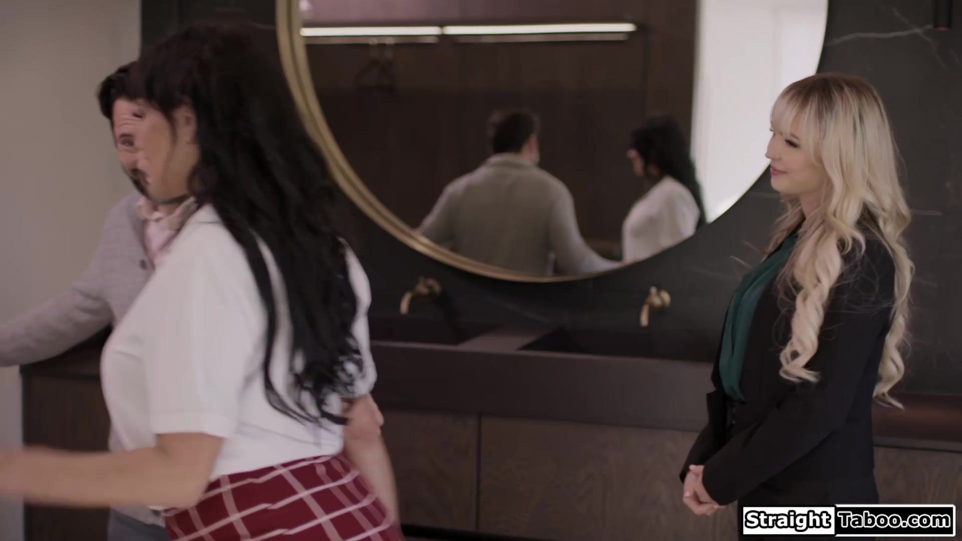 Horny realtor Lilly Bell locks clients wife in so she can suck off his dick.The blonde deepthroats him almost to the end before freeing his wife again.The petite babe is not finished and lets him eat her ass and hairy pussy before getting fucked