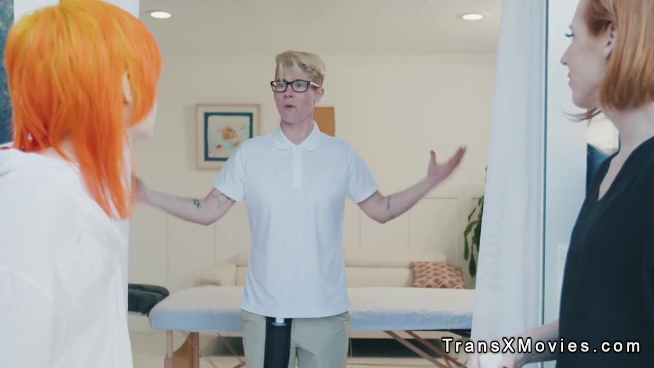 Shemale girlfriends Jean Hollywood and Shiri Allwood visit masseuse Kenzie Anne in massage parlor in resort and there have threesome sex action in various positions