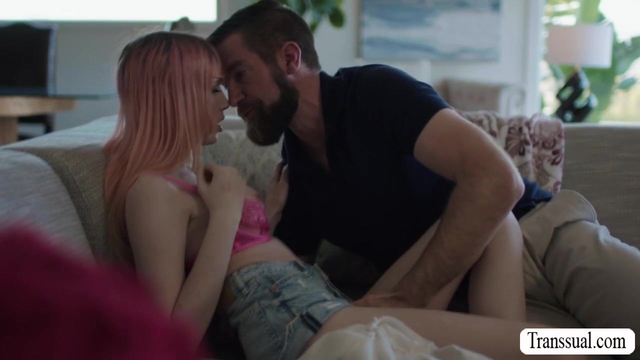 TS model and her stepdad are on the couch kissing each other.After that,she lets her stepdad lick her ass first and in return,she throats his hard big cock passionately before she lets him bareback fuck her wet ass so hard.